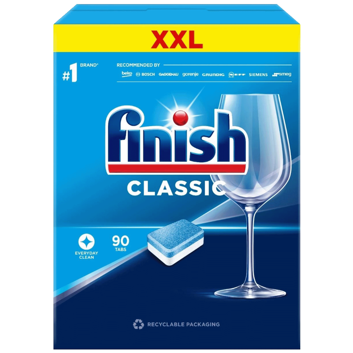 Tablete za mašinsko pranje posuđa, Finish Classic 90. Finish Classic je deterdžent bez fosfata za pranje posuđa u perilicama posuđa u tabletama. Finish Classic Tableta sadrži Powerball s formulom koja otapa i omekšava ostatke zagorjele hrane, a snažan deterdžent učinkovito uklanja prljavštinu sa stijenki posuđa. Pakiranje 90 komada Garancija: 12 mjeseci