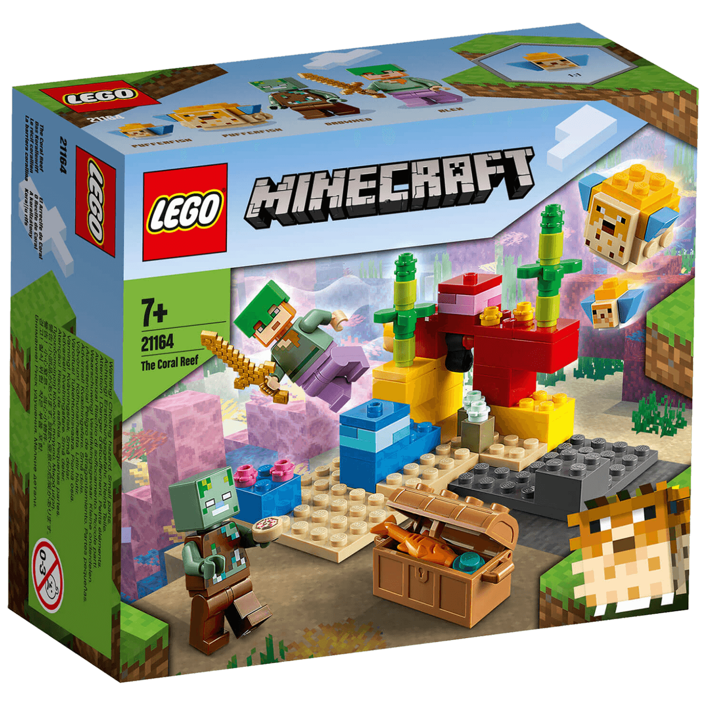 Pridruži se Alex ispod okeana u igri Minecraft™ dok traži sakriveno blago na raznobojnom koraljnom grebenu. Pozdravi 2 prijateljski raspoložene ribe. Izvrni veliki žuti kamen i pojavit će se škrinja sa blagom. Što je u njoj? Samo riba i… Biser! Pazi! Utopljenik ide prema tebi! Hoće li Alex poraziti zombija i zadržati blago? Samo ti možeš odlučiti. • LEGO® Minecraft™ Koraljni greben (21164) poslastica je za aktivnu igru za igrače Minecrafta u kojoj podvodne pustolovine iz igre oživljavaju uz LEGO® kocke koje se mogu ponovno složiti beskrajno mnogo puta. • Izdržljivi komplet iz serije LEGO® Minecraft™ sadrži popularnu junakinju igre Alex sa ronilačkom kacigom, čarobnim hlačama i mačem te utopljenika, 2 ribe (1 ‚napuhanu‛ i 1 normalnu) te dodatke. • Djeca se mogu pridružiti neustrašivoj i popularnoj Alex iz igre Minecraft™ dok roni u okeanu i traži sakriveno blago na raznobojnom koralnom grebenu i bori se protiv utopljenika kada je iznenada napadne. • Za djecu od 7 godina i starije. Oduševite igrače igre Minecraft™ kompletom igračaka za slaganje svijeta Minecrafta u stvarnosti. Savršeno iznenađenje za igrače koji žele prijeći na novi nivo igre u Minecraftu. • Komplet je viši od 7 cm, širok 10 cm i dubok 10 cm. Dovoljno je malen da stane u ruku, a dovoljno velik da privuče poglede kada se izloži. • Raznobojni koralni greben ima autentične detalje iz Minecrafta i nevjerojatne dodatke, kao što su skrivena škrinja s blagom koja se otvara i otkriva ribu i biser. • Komplet iz serije LEGO® Minecraft™ proizveden je tako da dugo traje, može se presložiti beskrajno mnogo puta i jednostavno se kombinuje sa drugim kompletima LEGO Minecraft. • U velikom izboru kompleta za igru iz serije LEGO® Minecraft™ internetska igra Minecraft oživljava uz likove, scene i elemente od maštovite mješavine izdržljivih LEGO® kockica. • LEGO® elementi ispunjavaju stroge standarde industrije kako bi bili skladni, kompatibilni te se savršeno spajali i razdvajali svaki put. Tako je još od 1958. • LEGO® dijelove bacamo, grijemo, lomimo, savijamo i analiziramo kako bismo bili sigurni da ispunjavaju stroge globalne standarde sigurnosti. Garancija: 12 mjeseci
