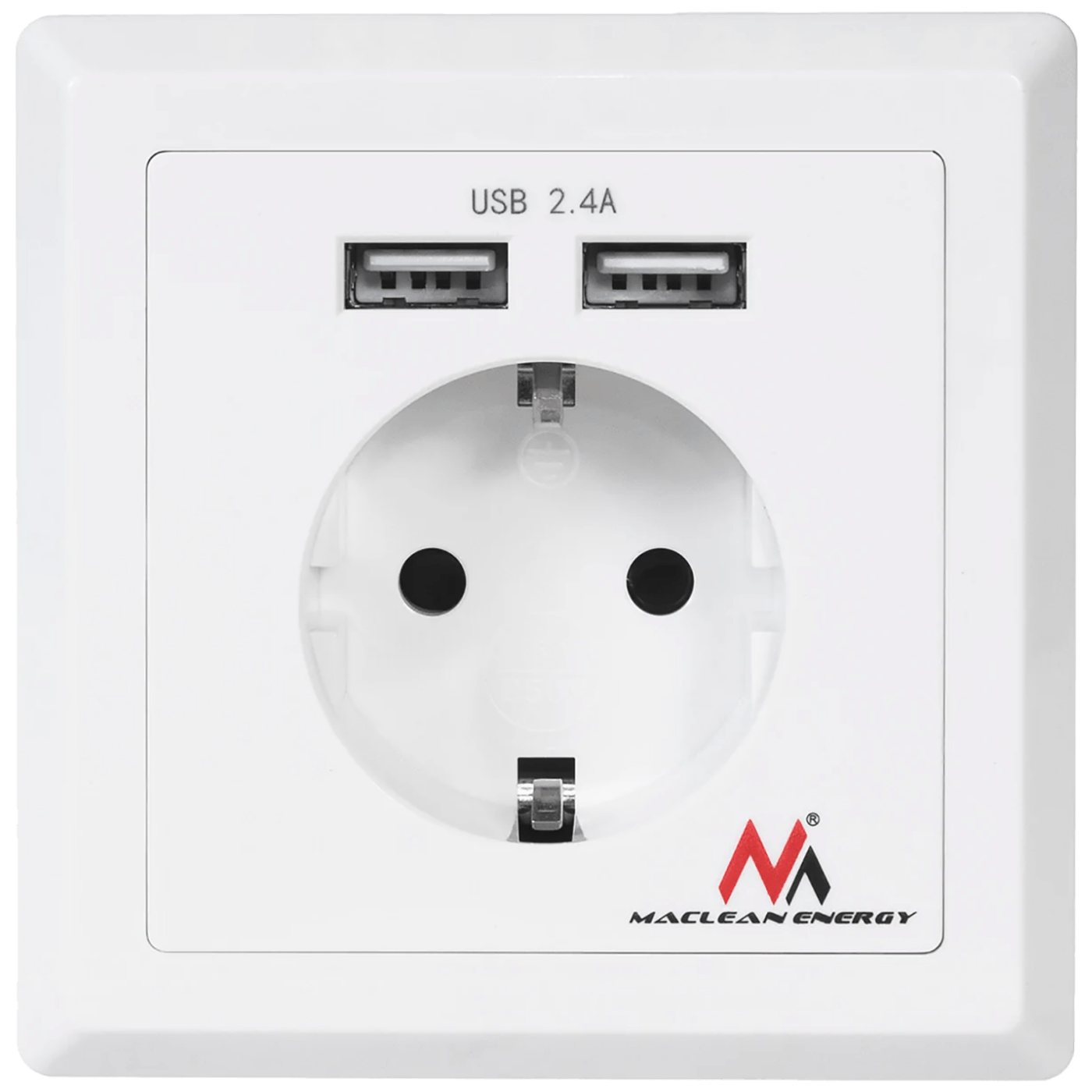 Maclean MCE237 ugradna Schuko utičnica ima 2 USB utičnice za punjenje. 2 x USB ulaza s max. 2.4A omogućuje punjenje do dva uređaja u isto vrijeme. Za jednostavno punjenje svih mobilnih uređaja koji imaju USB sučelje, kao što su iPhone, iPad i pametni telefoni. Sigurnosni sustav osigurava ispravan priključak struje. Tek kada čep ravnomjerno pritisne oba otvora, brava se vraća i oslobađa otvore, čime se osigurava sigurnost djeteta. Utičnica je osigurana ugrađenim osiguračem i automatskim podešavanjem napona punjenja. Utičnica se može koristiti u standardnoj podžbuknoj kutiji od 60 mm i mora se vodoravno pričvrstiti vijcima. Vertikalno pričvršćivanje nije moguće! Ploče se mogu ukloniti. USB priključci se ne mogu isključiti i ne mogu se koristiti kao dvostruka utičnica. Napon 100-250V / AC 16A, USB izlaz – DC 5V / 2.4A Garancija: 12 mjeseci