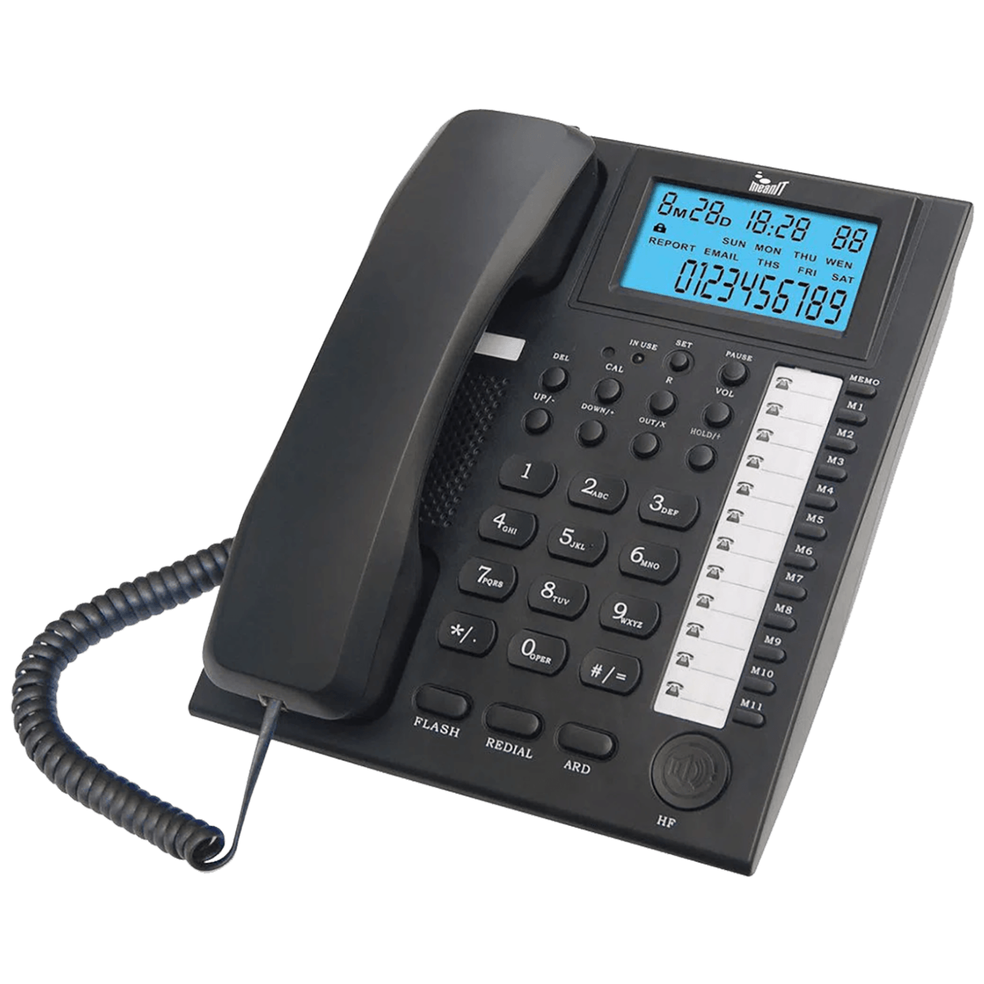 Analogni stolni telefon, žičani, Osvjetljeni LCD zaslon, tonsko / pulsno biranje, memoriranje do 50 dolaznih brojeva, memoriranje do 15 odlaznih brojeva, prikaz broja , datuma i vremena poziva, brzo biranje, memoriranje 11 brojeva na brzo biranje, funkcija zadržavanja poziva, Handsfree, ponovno biranje broja Garancija: 12 mjeseci