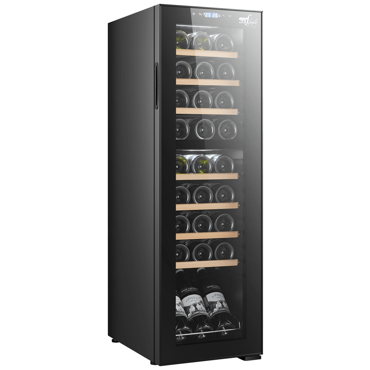 Rashladna vinska vitrina, kapacitet 27 boca, zapremina 74 litara, sustav hlađenja s kompresorom, unutarnje LED svjetlo, regulacija temperature gornja razina 5 – 18°C, regulacija temperature donja razina 5 – 18°C, zaslon na dodir s prikazom temperature, vrata od kaljenog stakla sa UV filterom, kromirane police, razina buke 47dB, energetski razred G. Napajanje 220 – 240V ~ 50Hz, snaga 70W Boja crna sa staklenim vratima Garancija: 12 mjeseci