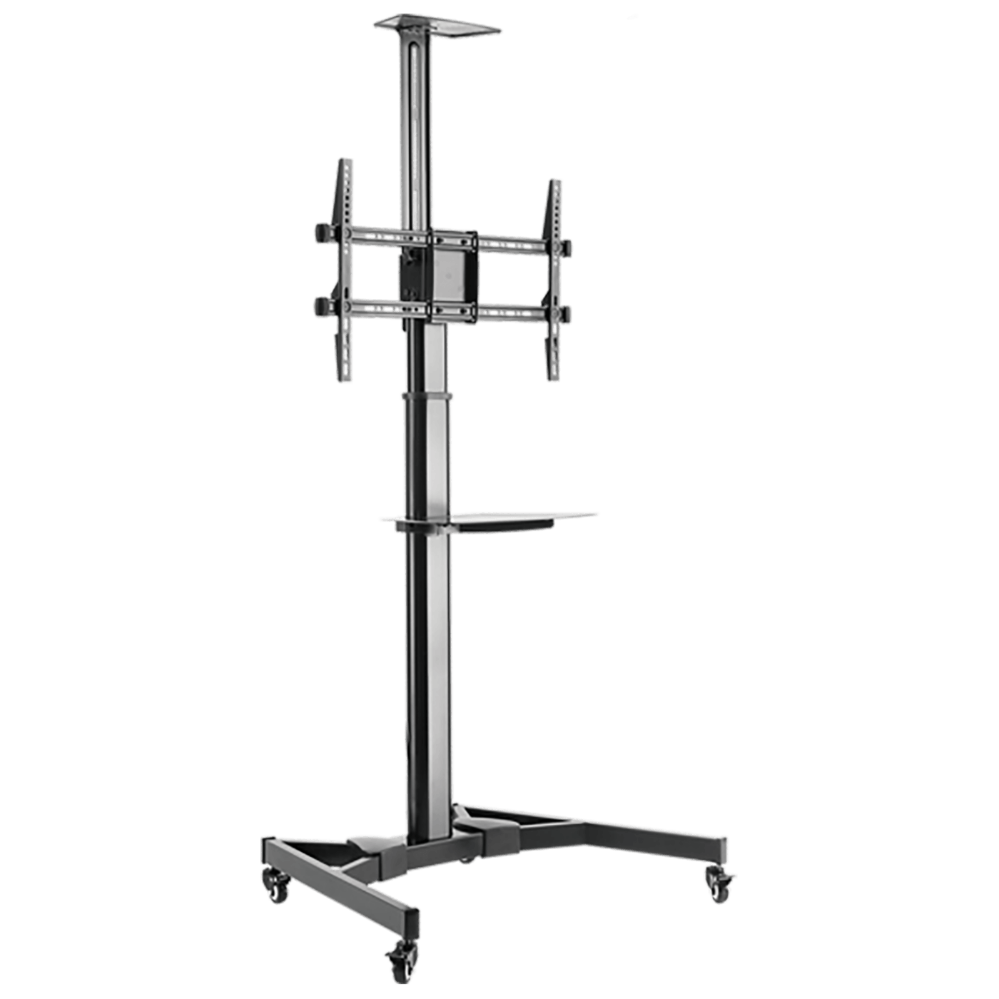 Stalak za TV prijemnike 37” – 70”, maksimalno opterećenje 50 kg., VESA 200 x 200, 600 x 400, nagib + / – 10°, polica za AV uređaj 430 x 335 mm nosivosti 5 kg., polica za kameru 285 x 150 mm, kotačići za lakše pomjeranje, pribor za montažu Garancija: 12 mjeseci