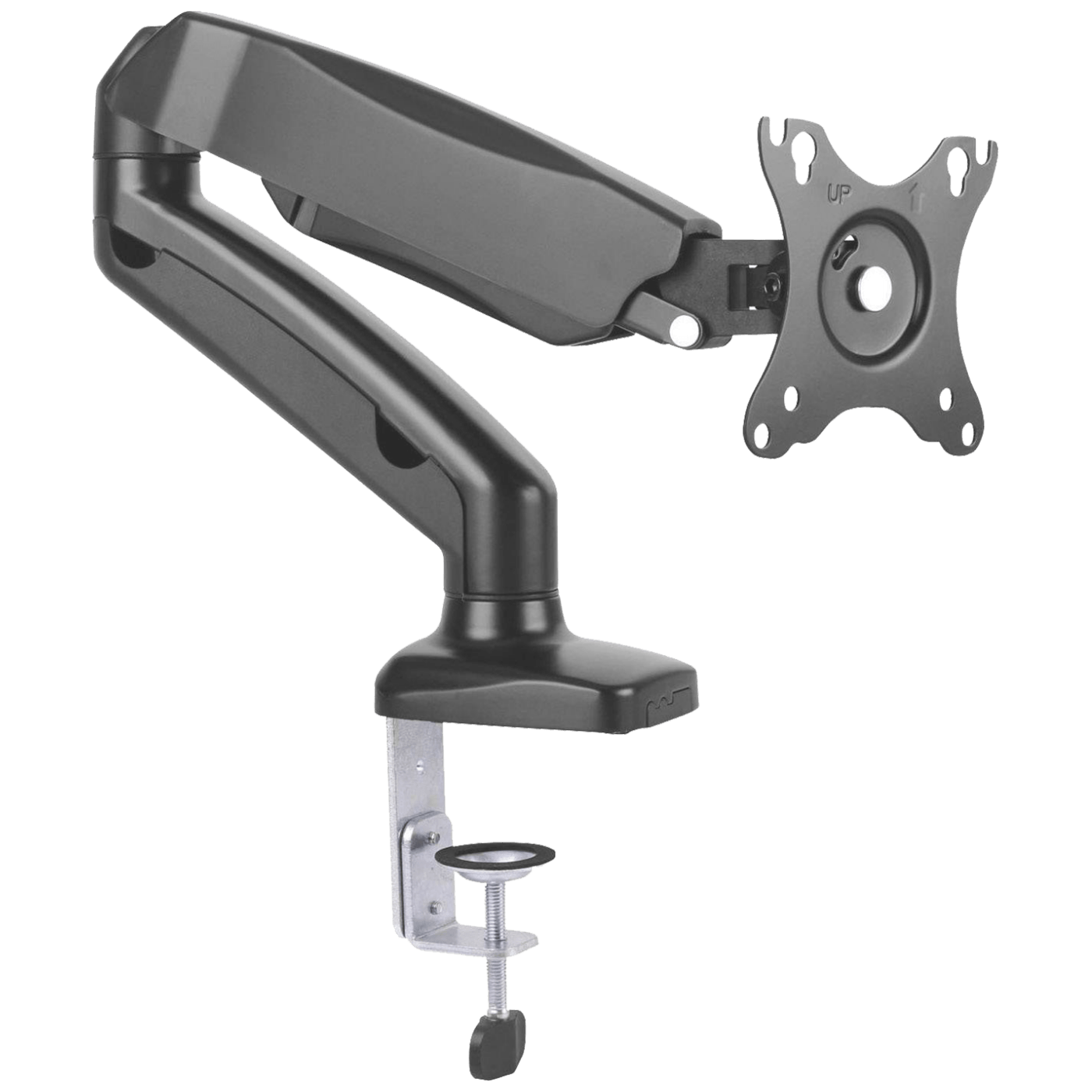 Stolni nosač za LCD monitor, veličine ekrana 13 – 27”, nosivost 2 – 6.5 kg, VESA: 75 x 75, 100 x 100, nagib + 90° / -45°, rotacija 360°, stezaljka za montažu ( 10 – 85 mm ), ploča adapter za fiksnu montažu, integrirana plinska opruga za glatko okomito podešavanje zaslona (maks. do 250 mm), pribor za montažu Garancija: 12 mjeseci