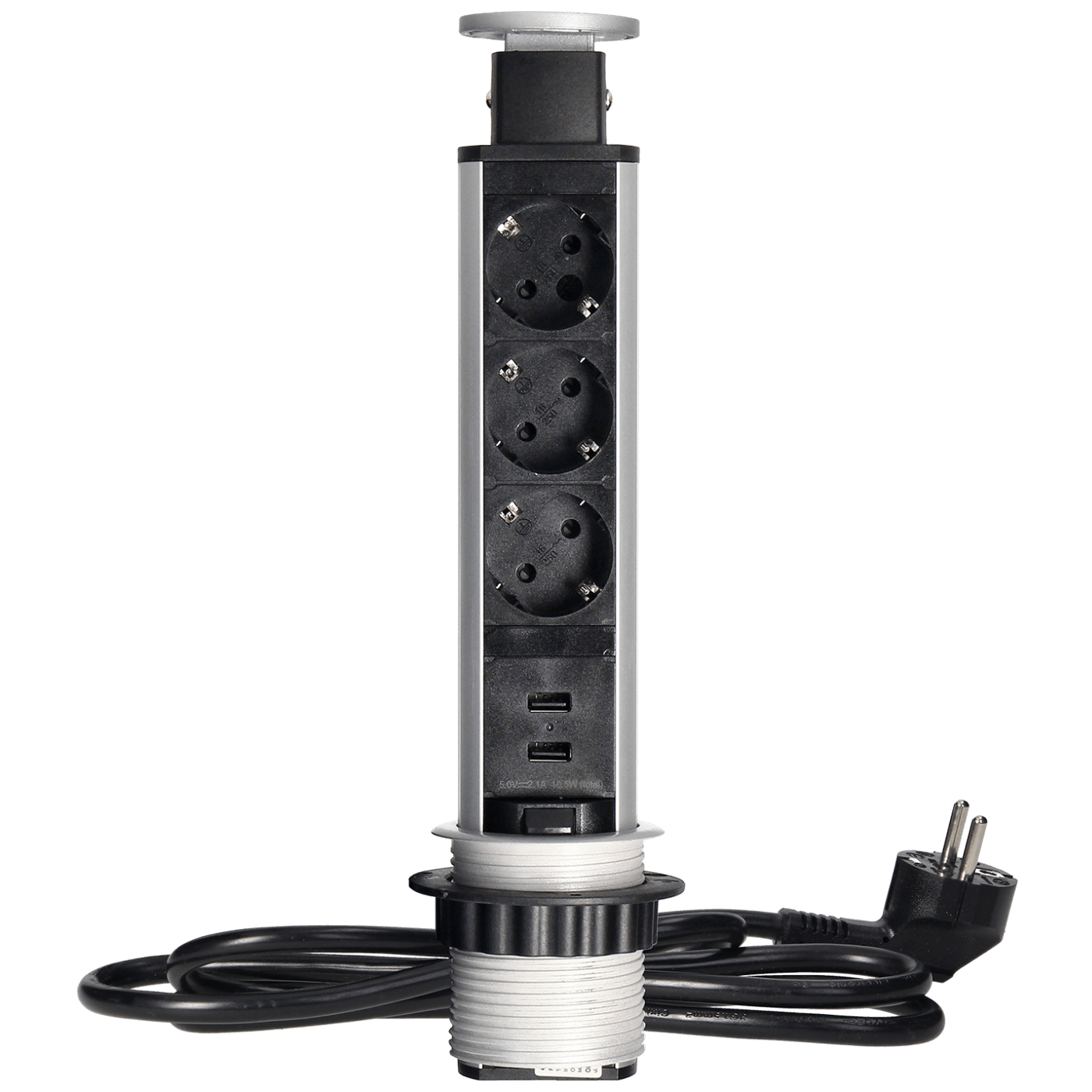 Produžni kabel tri Schuko utičnice 2P+E sa uzemljenjem i strujnom zaštitom kola, u kombinaciji sa USB punjačem. Sve je ugrađeno u kućište na uvlačenje koje omogućava pristup dodatnim električnim utičnicama. Posjeduje iskačući panel sa utičnicama, dodatnu bravu i kabel dužine 1.8 met. Dizajniran za unutrašnju ugradnju u stolove, ploče stolova i kancelarijski namještaj. Za ugradnju uređaja u ploču stola potrebna je samo jedna rupa prečnika 6 cm. Max.opterečenje 3680W, 3 x Schuko utičnice, 2 x USB utičnica, napon USB punjača 5V DC / 2.1A, dužina napojnog kabela 1.8 met., IP20 Materijal – plastike i srebrno obojenog metala Promjer 84.4 mm, dužina 315 mm, promjer rupe za ugradnju 63 mm, dubina rupe za ugradnju 315 mm Garancija: 24 mjeseci