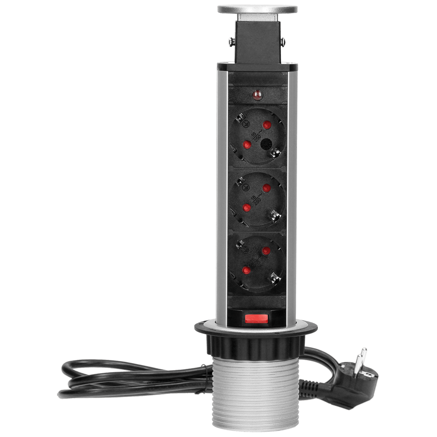 Produžni kabel tri Schuko utičnice tipa 2P+E sa uzemljenjem i sigurnosnim zatvaračima, u kućištu na uvlačenje. Dizajniran za unutrašnju ugradnju u stolove, ploče stolova i kancelarijski namještaj koji omogućavaju lak pristup utičnicama. Ima klizni panel sa utičnicama, dodatni sistem za blokiranje i kabel dužine 1.8 met. Za ugradnju u ploču stola potrebna je samo jedna rupa Ø6 cm. . Max.opterečenje 3680W, 3 x Schuko utičnice, dužina napojnog kabela 1.8 met., IP20 Materijal – plastika + lakirani metal, boja srebrena Promjer 84.4 mm, dužina 284 mm, promjer rupe za ugradnju 63 mm, dubina rupe za ugradnju 285 mm Garancija: 24 mjeseci