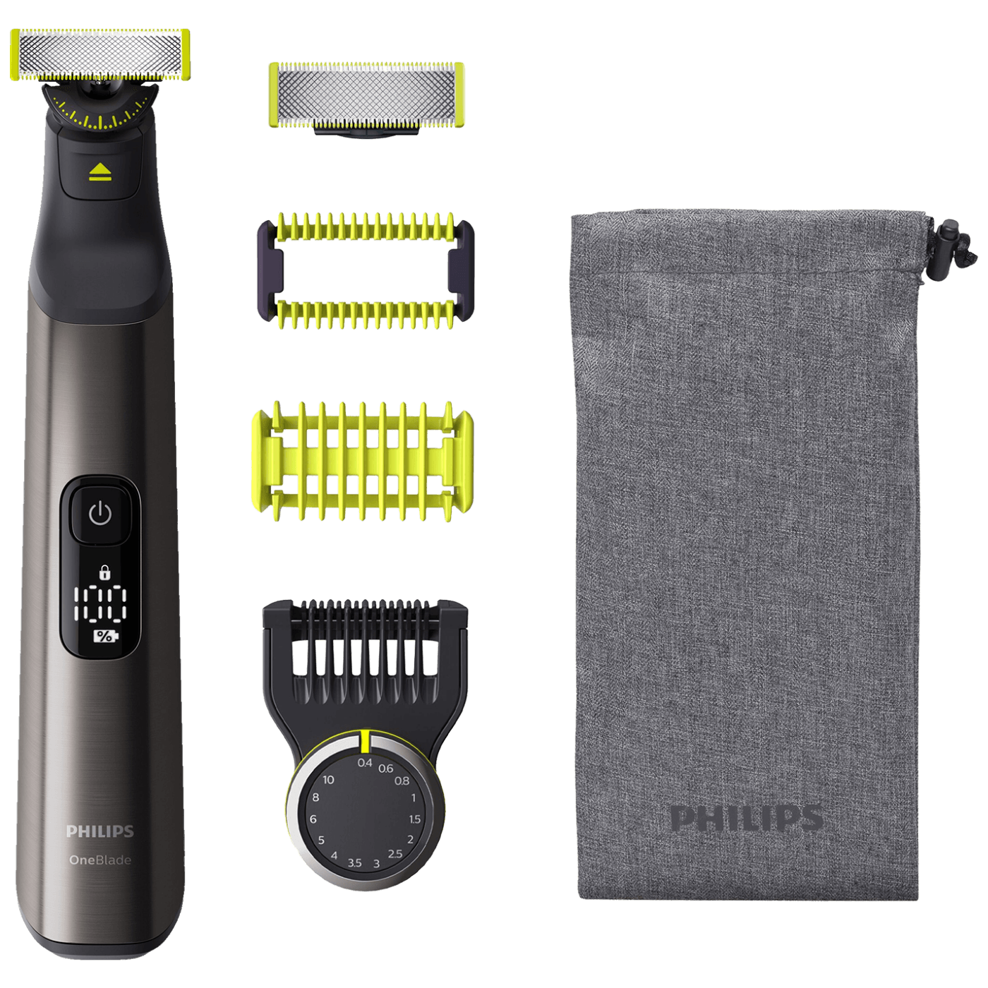Philips OneBlade Pro Face + Body podrezuje, oblikuje i brije dlačice bilo koje dužine. Sadrži jednu oštricu za lice i jednu sa štitnikom za kožu za dlačice na tijelu. Zaboravite na uporabu više alata. OneBlade radi sve. Philips OneBlade ima revolucionarnu tehnologiju za dotjerivanje dlačica na tijelu. Može brijati bilo koju dužinu dlačica. Njegov dvostruki zaštitni sustav – premaz za bolje klizenje u kombinaciji sa zaobljenim vrhovima – olakšava brijanje te ga čini ugodnijim. Njegova tehnologija brijanja obuhvaća rezač koji se brzo pomiče (12 000x u minuti), tako da je učinkovit čak i na dužim dlačicama. Inovativne oštrice 360 kreću se u svim smjerovima i prilagođavaju se svakoj konturi vašeg lica kako bi održale ugodan dodir s kožom, dok istodobno jamče neprekidnu kontrolu. Jednostavno podrezivanje i brijanje, čak i na najteže dostupnim područjima, uz manje poteza i veću ugodnost. Podrezujte bradu na ravnomjernu dužinu priloženim prilagodljivim preciznim češljem. Odaberite jednu od 14 postavki dužine za postizanje sve od jednodnevne brade do trodnevne ili duže brade. Ergonomska drška za udobno rukovanje, češalj s 14 postavki duljine (0,4 – 10 mm), štitnik za kožu koji se postavlja pritiskom, češalj za dlačice na tijelu koji se postavlja pritiskom Indikator funkcije putnog zaključavanje, vrijeme rada 120 min., vrijeme punjenja 1h, Li-Ion baterija, LED digitalni zaslon Za vlažno i suho korištenje Zamjenska glava QP210, QP220, QP230, QP610, QP620, QP410, QP420 Garancija: 12 mjeseci