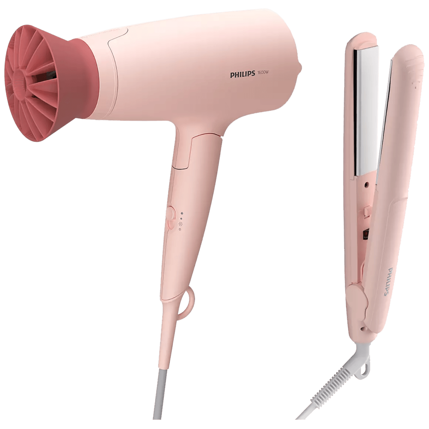 Jedinstveno dizajniran dodatak ThermoProtect snažno miješa topao i hladan zrak za svakodnevnu njegu. Fen, snaga 1600W, preklopna ručka, 3 brzine rada i temperature, kukica za vješanje, dužina napojnog kabla 1.8 met., 11 mm mlaznica zraka. Pegla za kosu, snaga 31 – 33 W, keramičke ploče sa keratinskim premazom, dimenzije ploča 19 x 85 mm, vrijeme zagrijavanja 60 sec., temperatura do 210 °C, dužina napojnog kabla 1.6 met. Garancija: 24 mjeseci