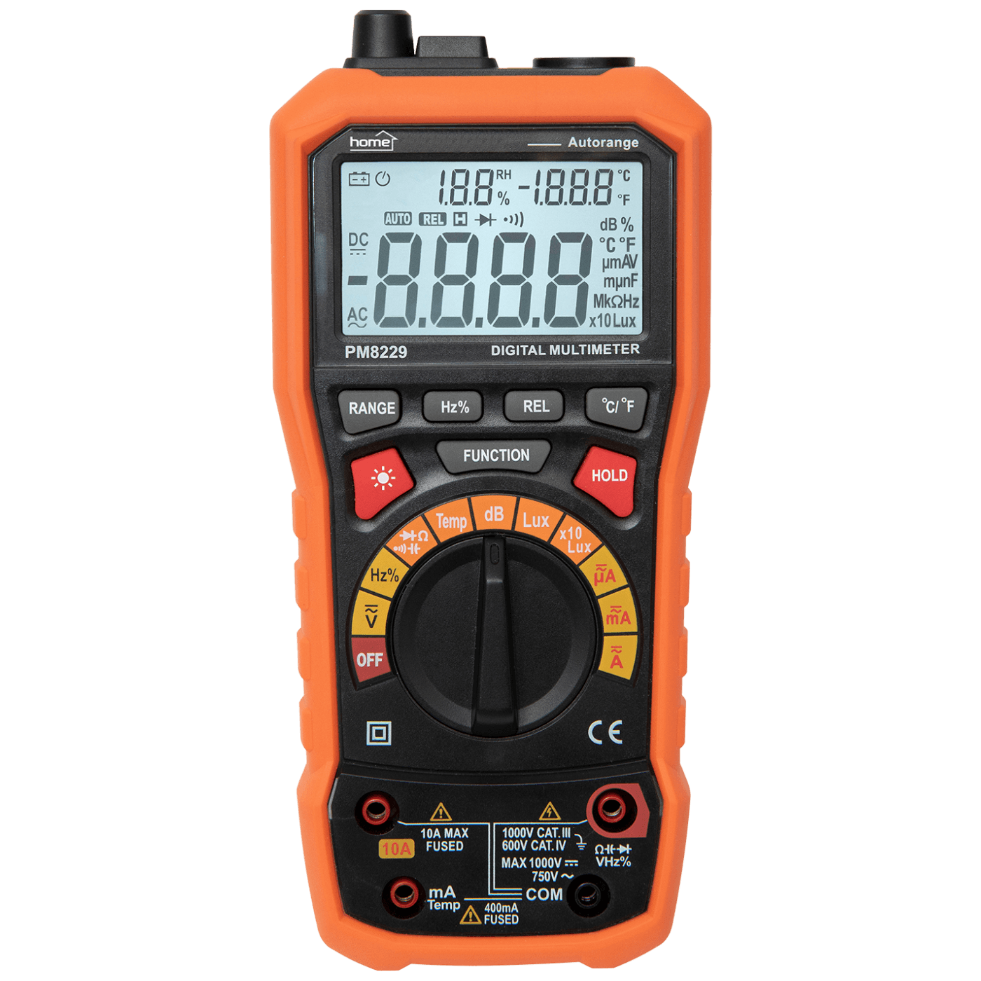 Profesionalni digitalni mjerni instrument, 6u1, puni opseg električnih mjerenja, temperatura i vlažnost okoline, površinska temperatura sa sondom, mjerenje zvučnog pritiska, mjerenje svjetline, namjenska traka za prikaz topline i vlage, veliki osvijetljeni zaslon, automatska ili ručna promjena raspona mjerenja, snimanje izmjerene vrijednosti, relativni način mjerenja, automatsko isključivanje, brisanje, čvrsti, gumirani poklopac, stražnji držač za ispitne vodove, rasklopivi nosač za stol Napajanje 4 x AA (1,5V) baterije uključene u pakiranje, ispitni vodovi, sonda termometra, torbica, dimenzije 94 x 204 x 57 mm Garancija: 12 mjeseci