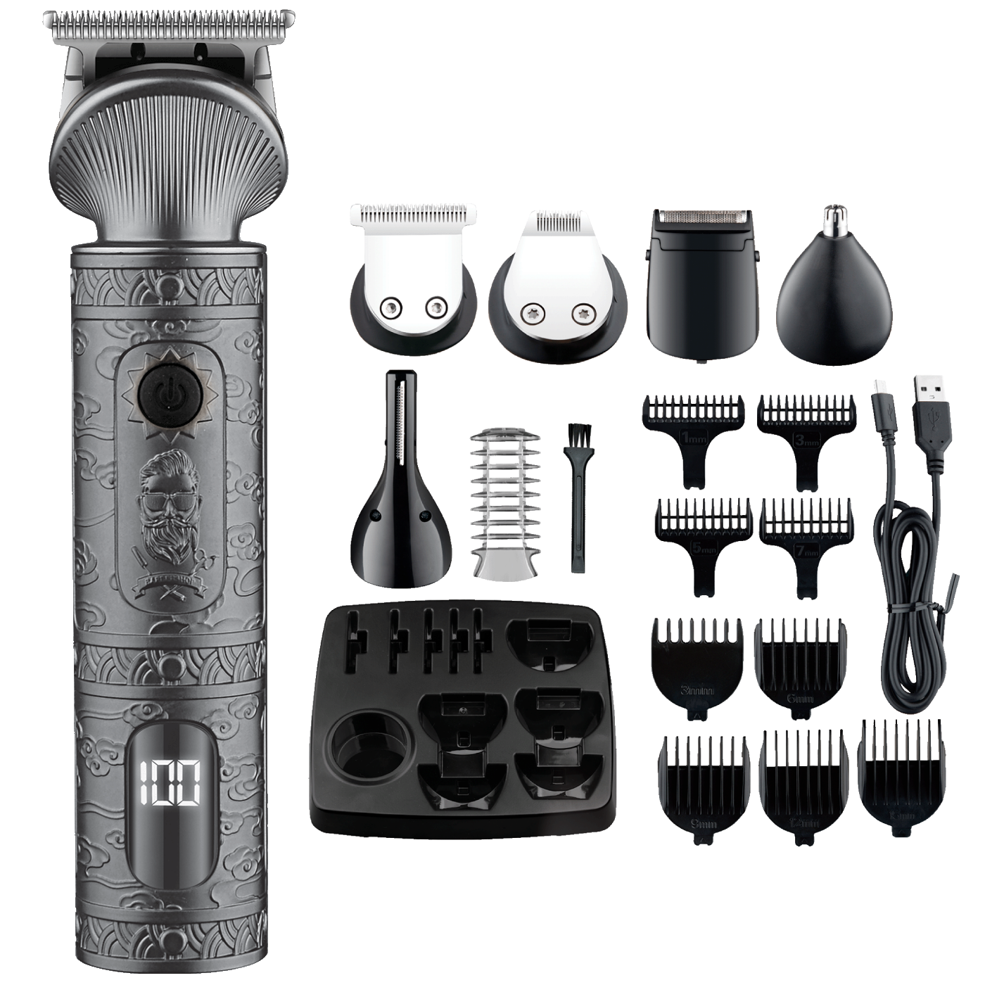 Aparat za šišanje, brijanje, trimer, 16u1, Apollon • Brzo punjenje • 90 minuta vremena punjenja/140-170 minuta korištenja • Žičana i bežična uporaba • Zaključavanje za putovanje • Oštrica od nehrđajućeg čelika • Metalno tijelo • LED zaslon • Oštrice koje se mogu ukloniti i prati • Nastavci 1 / 3 / 5 / 7 mm, 3 mm, 6 / 9 / 12 / 15 mm • glava za šišanje / trimer za bradu / trimer za dlačice u nosu i ušima • USB kabel 1 met. • Četka za čišćenje i baza za dijelove • Napajanje Li-ion baterija (18500 / 1200mAh / 3.7V) • Putna vrećica • Jednostavno čišćenje Garancija: 24 mjeseci