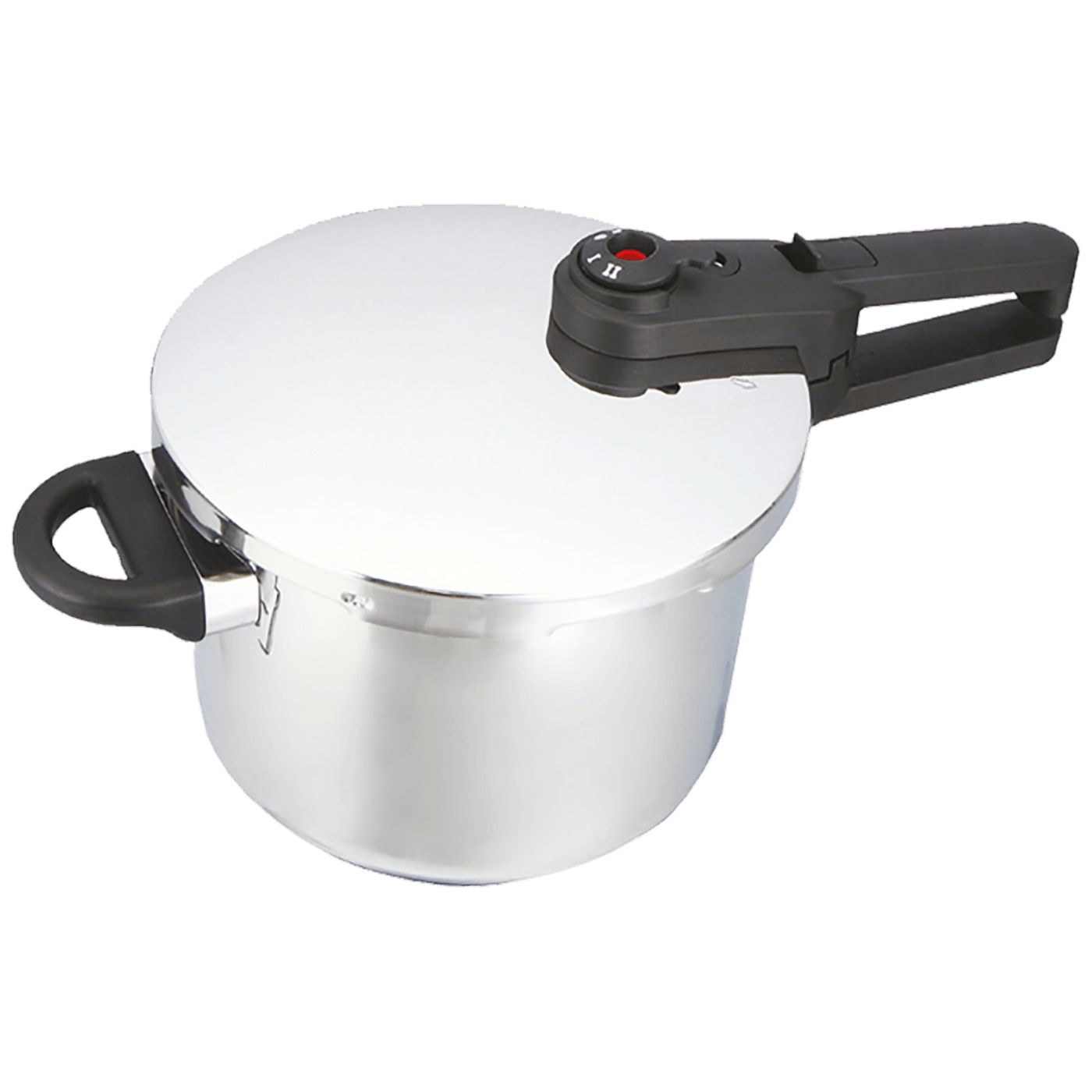 Expres (pretis) lonac, zapremina 6 lit, nehrđajući čelik 18/10, brzo zagrijavanje i učinkovito održavanje topline zahvaljujući troslojnoj bazi, sigurnosni ventil, regulator tlaka, unutarnja mjerna ljestvica, poklopac sa sigurnosnom bravom, može se koristiti na svi vrstama ploča za kuhanje uključujući indukcijske ploče Garancija: 24 mjeseci