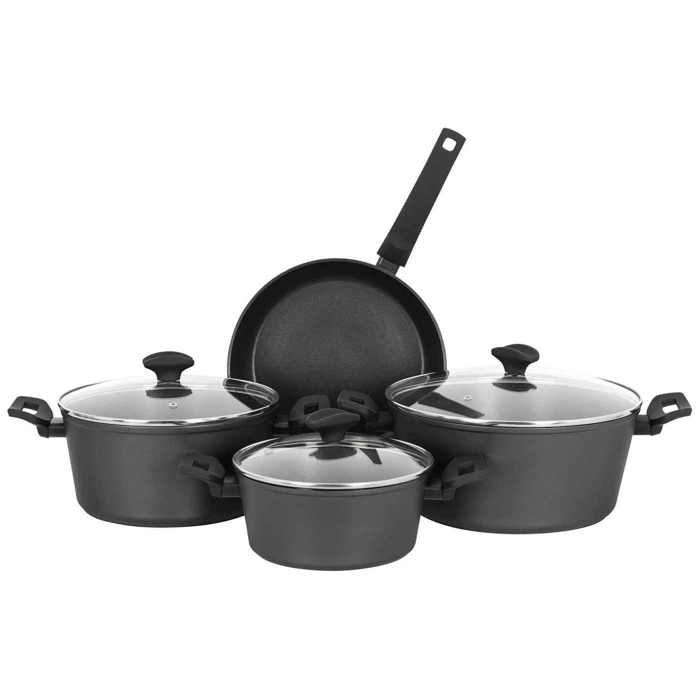 Posuđe, set, 7/1, materijal izrade aluminijum, unutarnji neljepljivi premaz, PTFE vanjski premaz otporan na toplinu Set se sastoji od: 3 lonca ( 20, 24 x 28 cm), 1 tava 26 cm, 3 staklena poklopca otporna na visoke temperature. Eco Safe tehnologija Posuđe može se koristiti na svi vrstama ploča za kuhanje uključujući indukcijske ploče. Garancija: 24 mjeseci