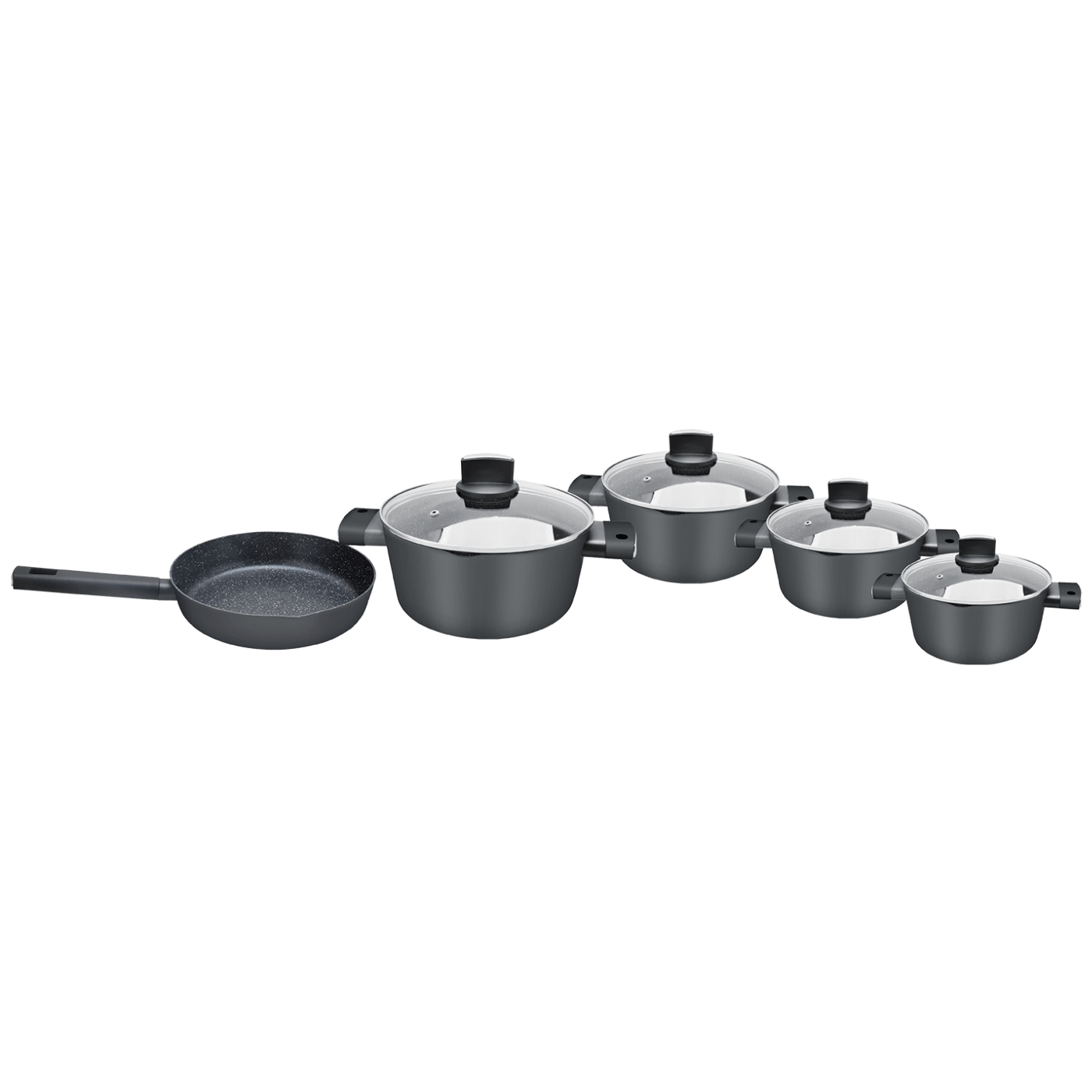 Posuđe, set, 9/1 Set se sastoji od: 4 šerpe ( 18, 20, 24, 28 cm), 1 tava 26 cm, 4 staklena poklopca otporna na visoke temperature. Soft Touch ručka Posuđe može se koristiti na svi vrstama ploča za kuhanje uključujući indukcijske ploče. Garancija: 24 mjeseci